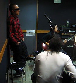 #3 DATE 2006/10/5 by MIZK ドラマー金子 誕生!! スタジオ3回目、最初からアクシデントが起きた。 今回のフリスタバンドの重要なパートを担うブルースマンHATAが、テンション低い声で電話をかけてくる。 ”すまん、胃が痛くて今日はスタジオ行けん。。。” ムキーーーー!! 恐れていたことが… HATAがいないと練習にならん… ハ、ハタがいないと俺は何も出来ないんだ… という本音は一切ひたかくし、僕はひかげさんと誠一朗に向かって声高らかにこう言った! ”問題ナッシング!! 俺達だけで出来る!! オールオッケー!!!” 冷や汗をかきながら言った。 結果。 その言葉の通りかなりいい音をつくれた。 いいぞ俺達!! そして、 体早く直せよ、HATA(笑) ほんと頼むよ。 ギターを奏でるひかげ嬢 今回からフォトノス金子さんドラムとして参加だ! はじめてだと言っていたのに8ビートは意外といける。 凄い!やった! そして歌もやった! ピンクフロイド!! wish you were here!! ・・・ この歌は難しい・・・ 却下だ、アハハ(泣) 金子さん、期待してます。 >>おまけ 現在のLIVE用ソングリスト ※どんどん増やします!!